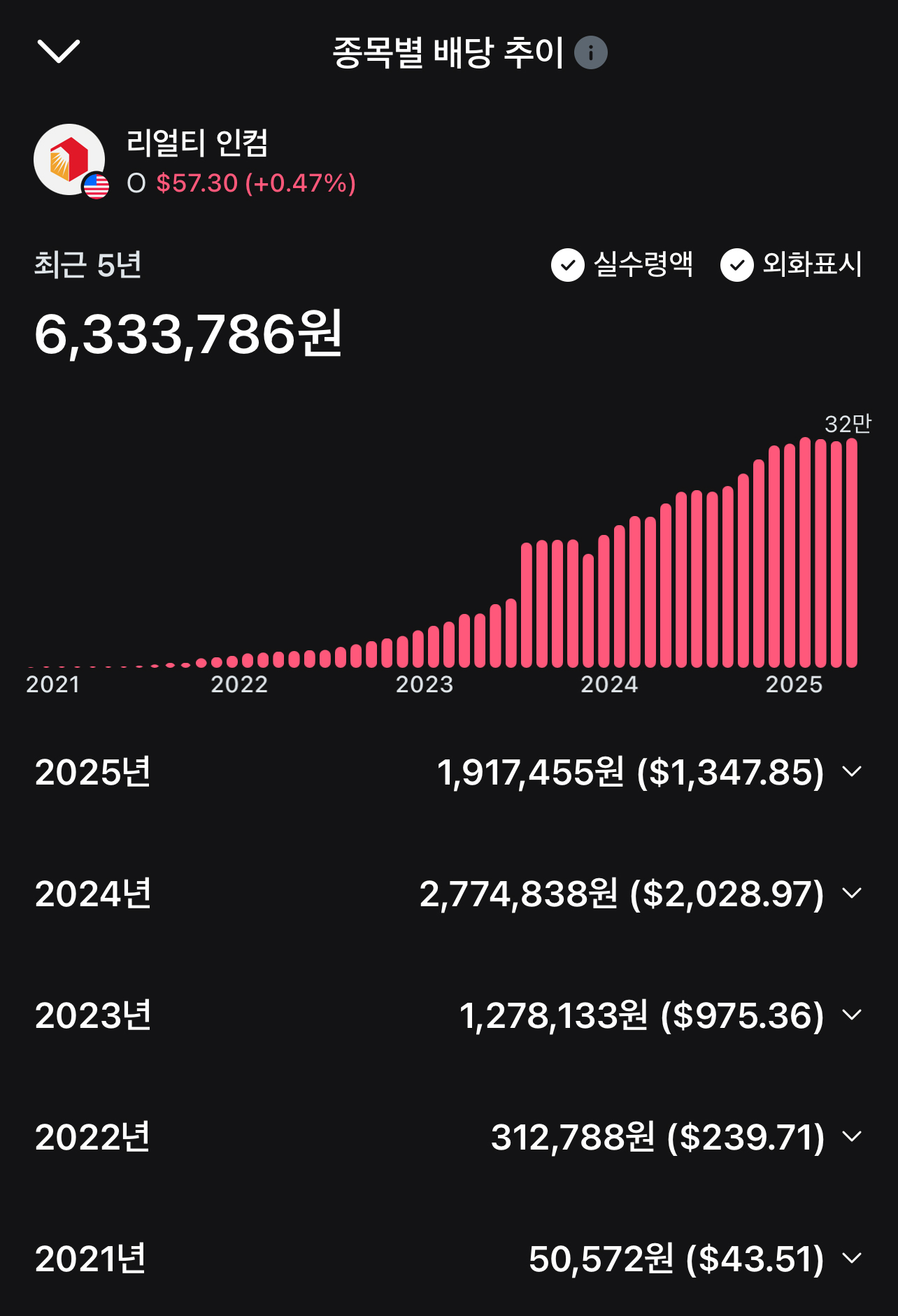 25년 5월 배당(세후)- JEPI(미국) : 1,708원($1.24)- JEPQ(미국) : 2,004원($1.46)- 애플(미국) : 3,090원( $ 2.21)- 리얼티인컴(미국) : 319,063원($228.23)- 삼성전자(한국) : 365원 총 326,230원 comment이번 달은 리얼티인컴