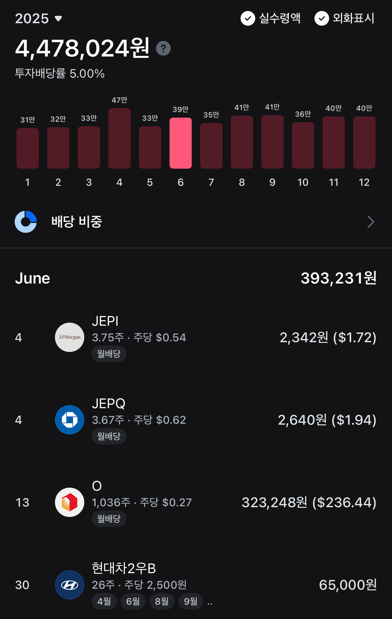 25년 6월 배당금 393,231원(JEPI,JEPQ,리얼티인컴,현대차2우B) 본문