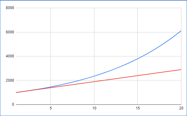 빨간 선은 단리, 파란 선은 복리를 의미한다.